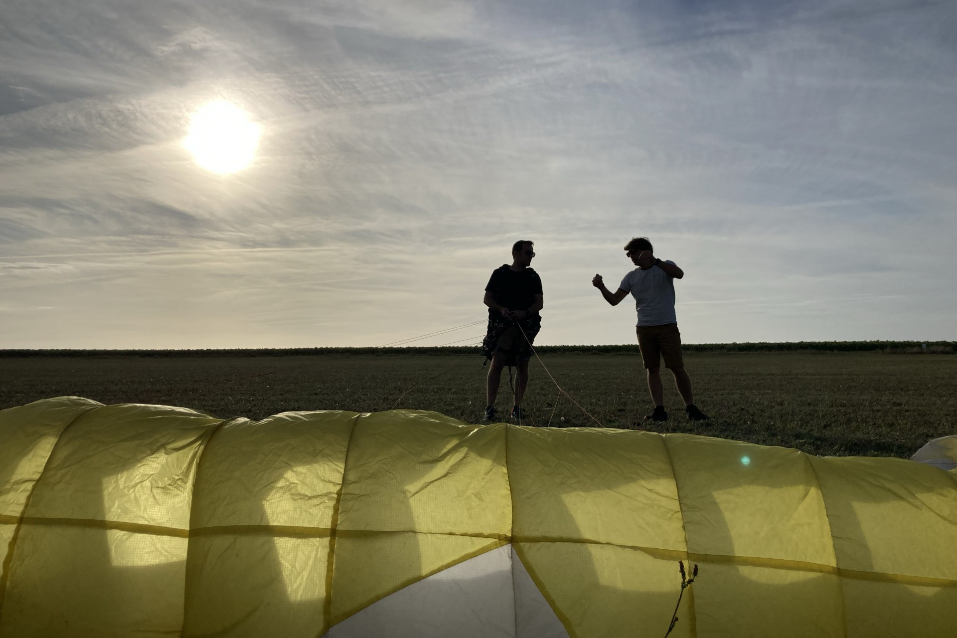 Première phase d'apprentissage pour Cédric, un futur pilote : le gonflage sous voile :)